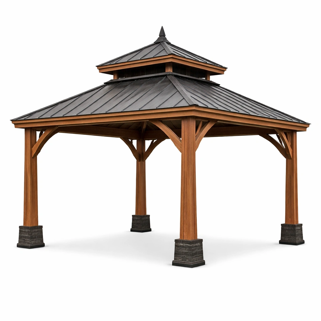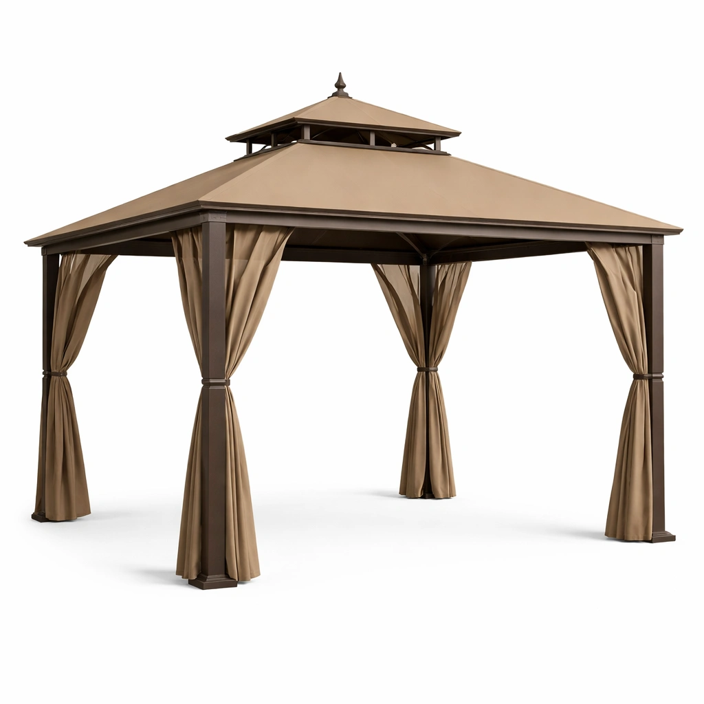 Gazebo de jardín de metal con techo doble y cortinas de poliéster